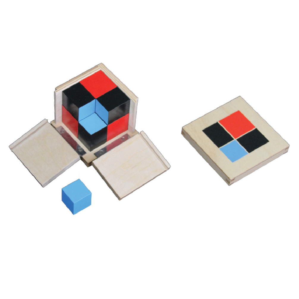 This set consists of 8 wooden component cubes and prisms painted red, blue and black. It is contained in a box having two adjacent hinged sides and a lid.