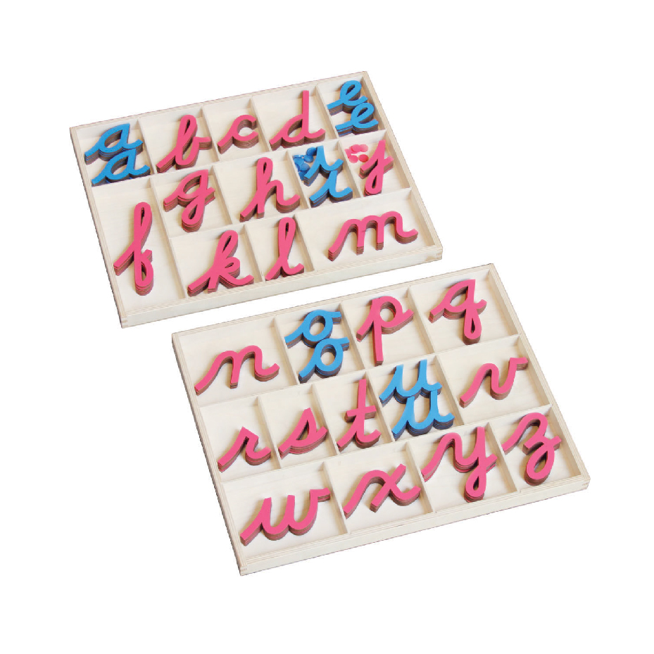 This set of wooden letters consist of 5 of each consonants in pink and 10 of each vowels in blue in 2 boxes. (Box size 19 ¼’’ x 15 ¾’’)
