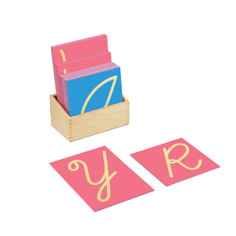 The Sandpaper letters are mounted on wooden boards with the vowels on blue boards and the consonants on pink boards with each letter in upper case. Box included.