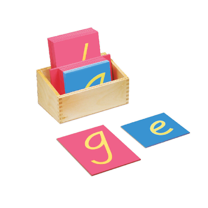 The Sandpaper letters are mounted on wooden boards with the vowels on blue boards and the consonants on pink boards with each letter in lower case. Box included.